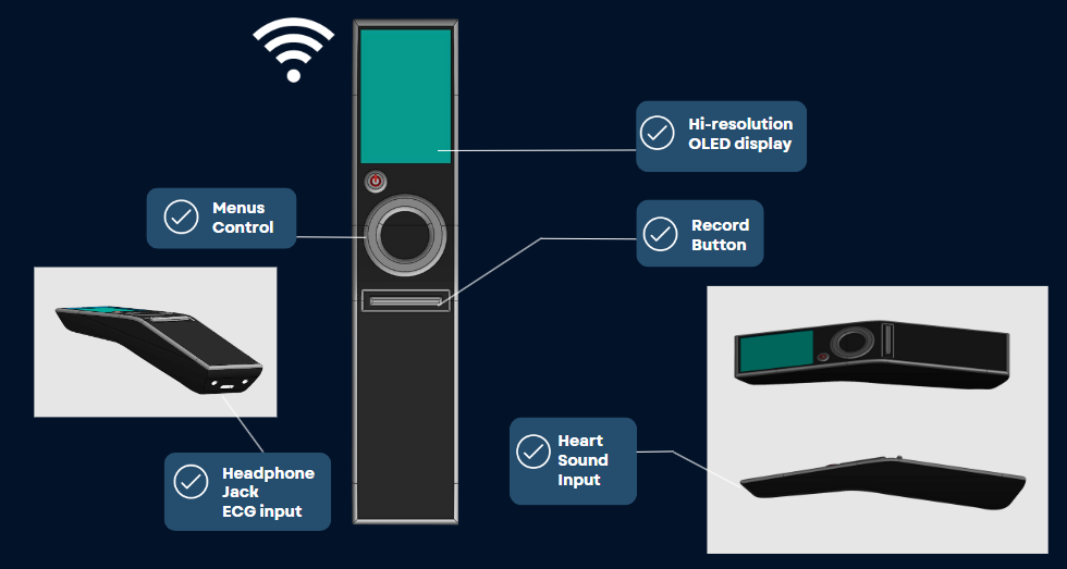 Intelliscope hardware incorporates dry electrode-based 3-lead ECG integration. This wireless stethoscope has the ability to record synchronized high quality PCG and ECG signals with a powerful AI backend. The ECG add-on is carefully designed with a unique shape, making it very easy to use. The battery powered circuitry inside the control unit, provides filtering and active noise cancellation to the acquired signals and wirelessly transmits them to the user’s mobile phone or computer; allowing the user to record, visualize and analyze the data.